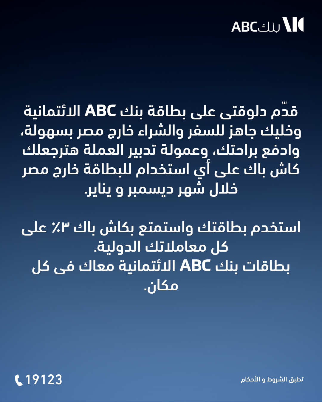 أعلن بنك ABC مصر، عبر صفحته الرسمية على موقع التواصل الاجتماعي فيسبوك، عن حملته الترويجية الجديدة للعملاء حاملي بطاقاته الائتمانية.