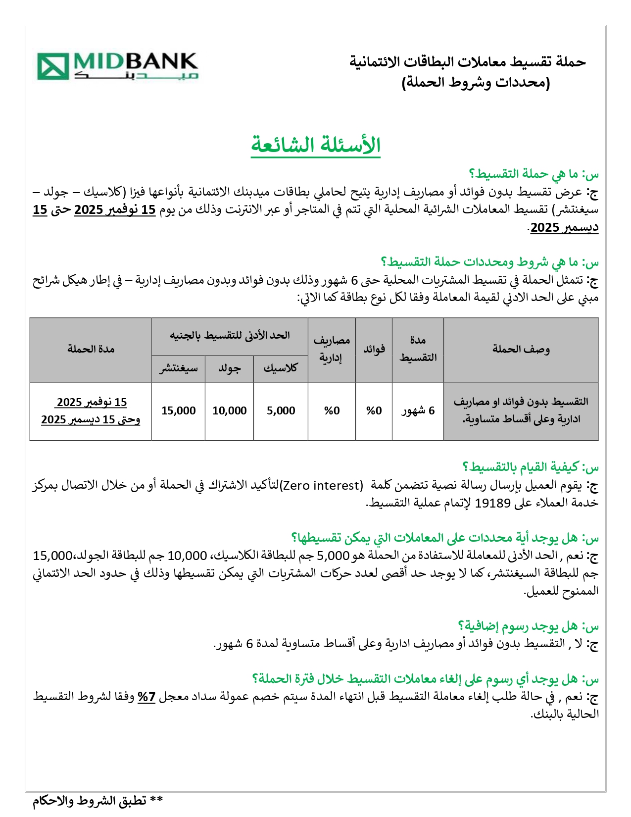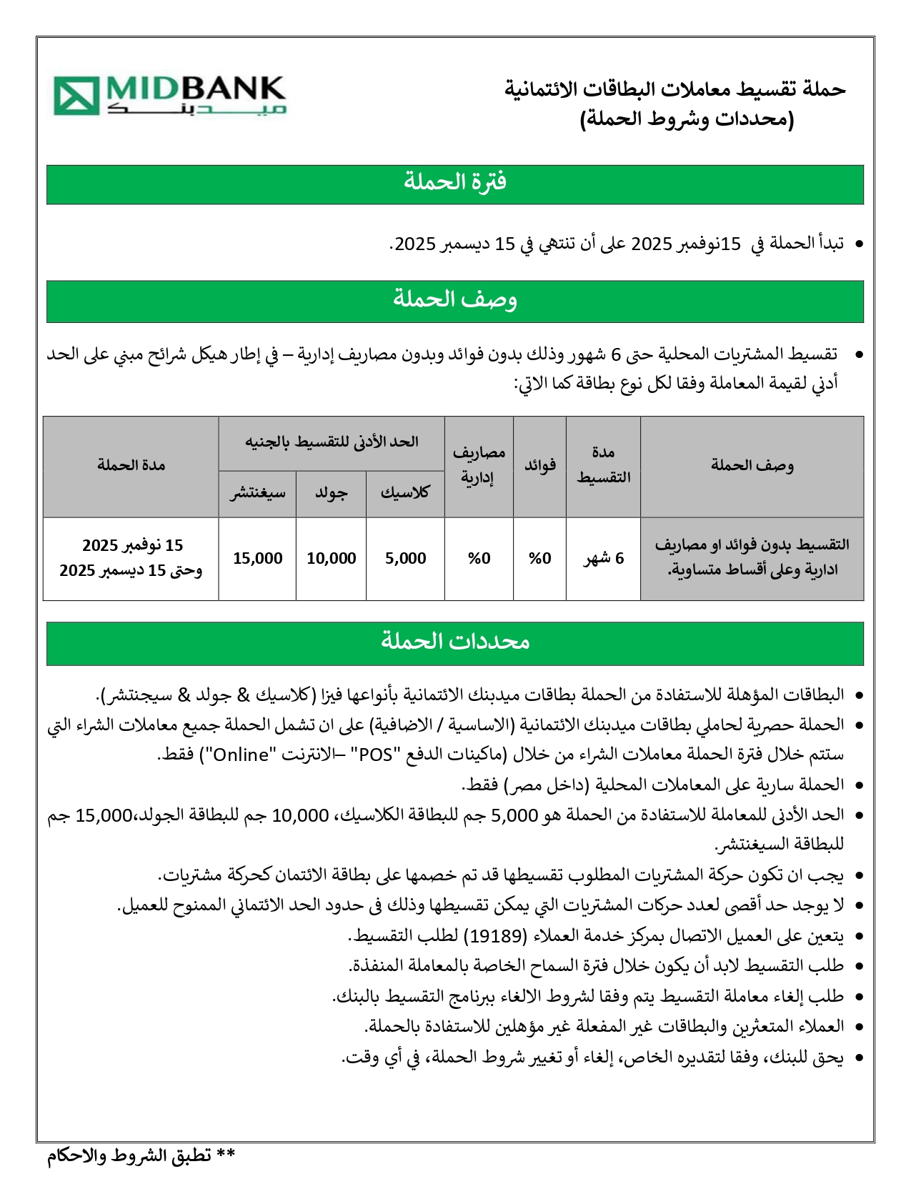 وتحت شعار (مع بطاقة ميدبنك الائتمانية…الفايدة مش عليك!)، يتيح البنك للعملاء تقسيط المشتريات