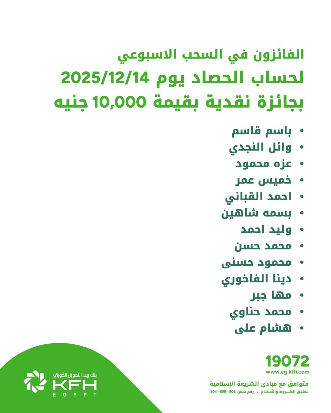 أعلن بنك بيت التمويل الكويتي مصر، عن أسماء الفائزين في السحب الأسبوعي الثاني لحساب الحصاد يوم 14-12-2025 بجائزة نقدية بقيمة 10.000 جنيه.