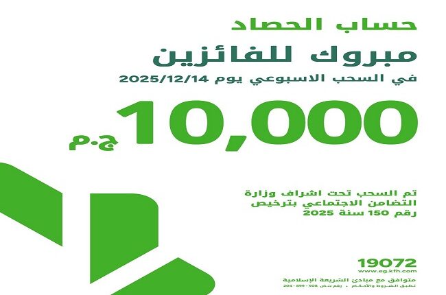 أعلن بنك بيت التمويل الكويتي مصر، عن أسماء الفائزين في السحب الأسبوعي الثاني لحساب الحصاد يوم 14-12-2025 بجائزة نقدية بقيمة 10.000 جنيه.