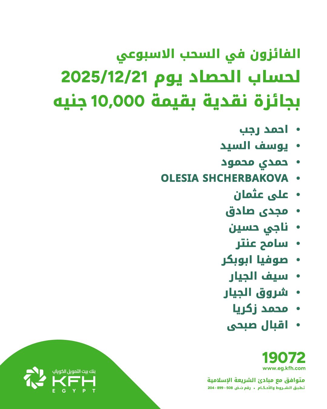 أعلن بنك بيت التمويل الكويتي مصر، عن أسماء الفائزين في السحب الأسبوعي لحساب الحصاد اليوم 21-12-2025 بجائزة نقدية بقيمة 10.000 جنيه.