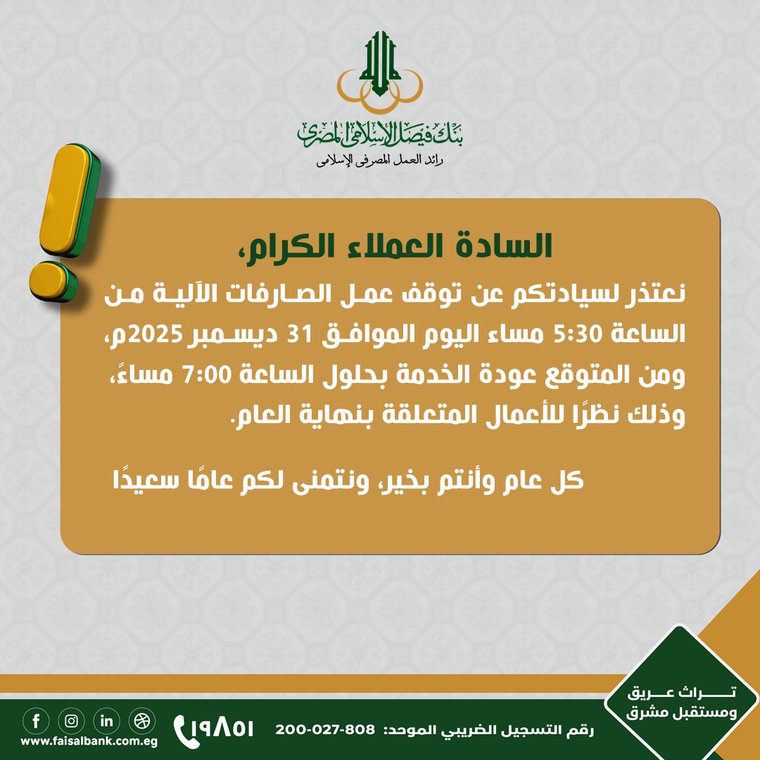 وقال بنك فيصل إن ماكينات الصراف الآلي ستتوقف عن العمل من الساعة 5:30 مساء اليوم الموافق 31 ديسمبر 2025، وذلك نظرًا للأعمال المتعلقة بنهاية العام.