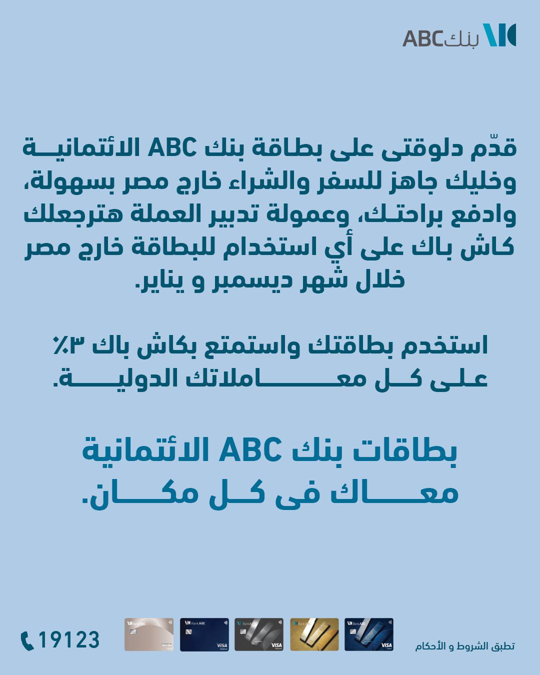 أعلن بنك ABC مصر، عبر صفحته الرسمية على موقع التواصل الاجتماعي فيسبوك، عن أحدث عروضه للعملاء حاملي بطاقاته الائتمانية.
