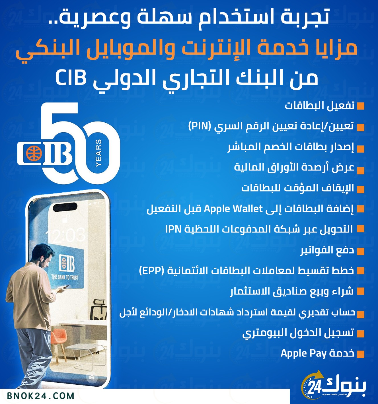 وتستعرض بوابة (بنوك 24) في الإنفوجرافيك التالي مزايا خدمة الإنترنت والموبايل البنكي من البنك التجاري الدولي CIB.