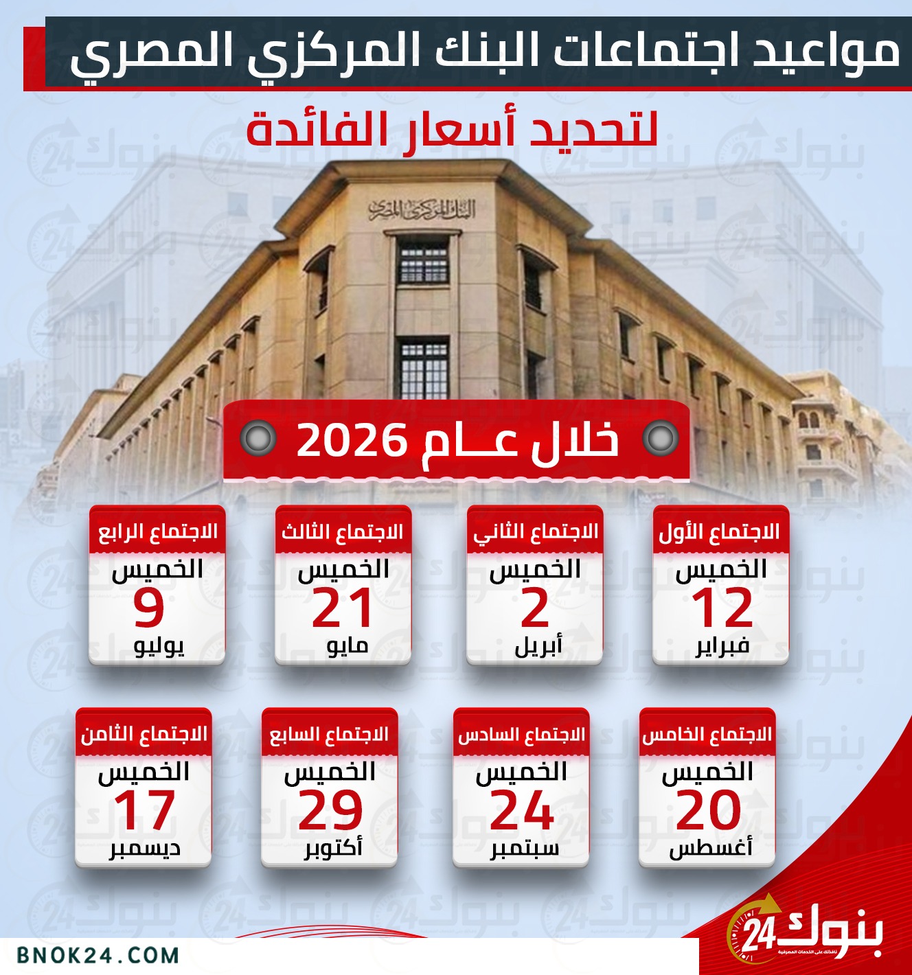 مواعيد اجتماعات البنك المركزي المصري لتحديد أسعار الفائدة خلال عام 2026 «إنفوجرافيك»