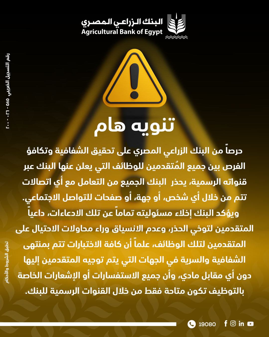 البنك الزراعي المصري يحذر من إعلانات توظيف وهمية وعمليات احتيال تستهدف المتقدمين