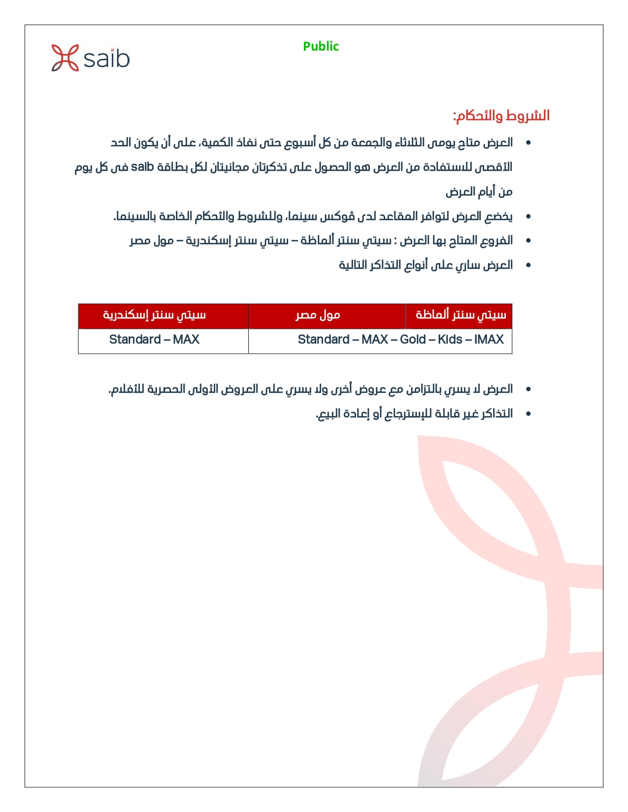 ويتيح البنك حجز تذاكر السينما من VOX Cinema أونلاين عند الحجز ببطاقة بنك saib والحصول على تذكرة مجانية يومي الثلاثاء والجمعة.