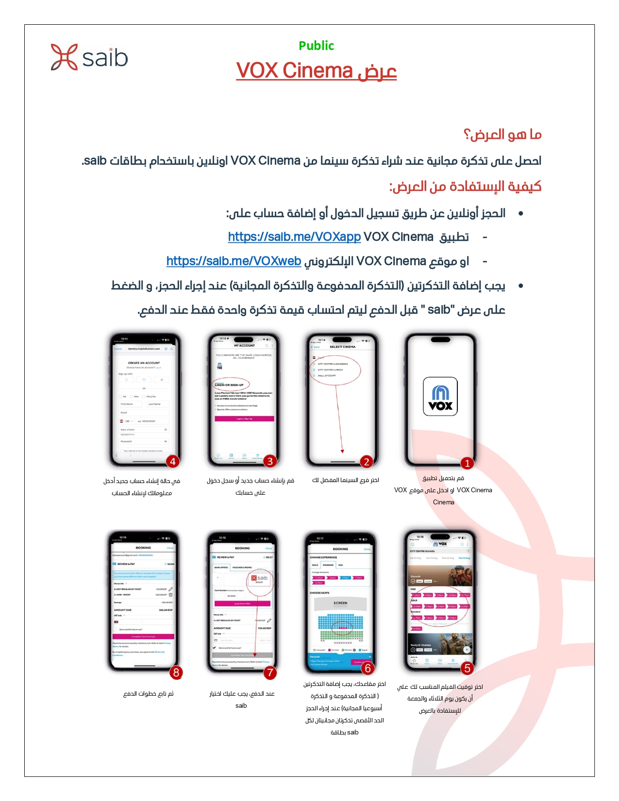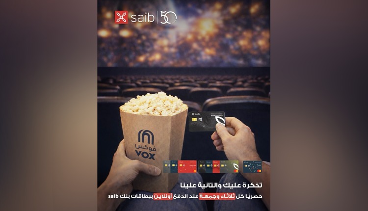 ويتيح البنك حجز تذاكر السينما من VOX Cinema أونلاين عند الحجز ببطاقة بنك saib والحصول على تذكرة مجانية يومي الثلاثاء والجمعة.