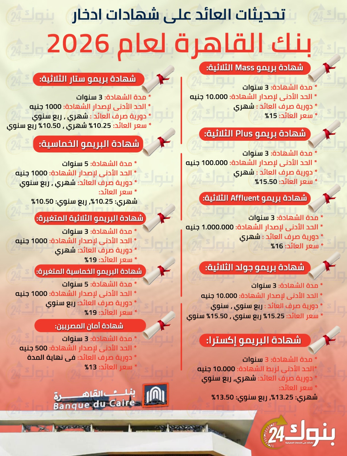 تحديثات العائد على شهادات ادخار بنك القاهرة لعام 2026 «إنفوجرافيك»