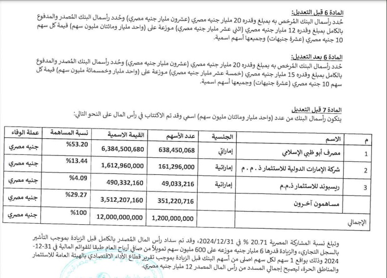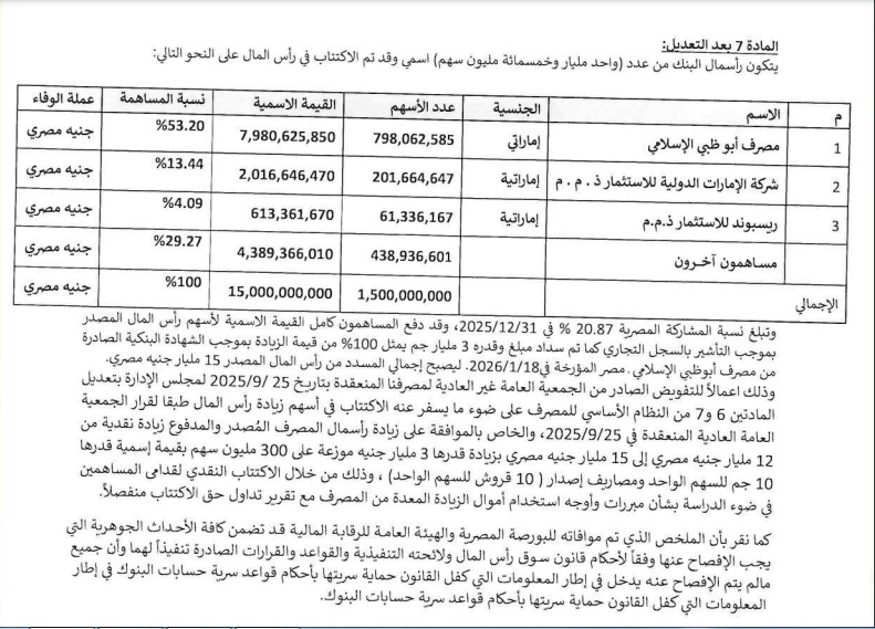 أعلن مصرف أبوظبي الإسلامي – مصر، في إفصاح للبورصة المصرية اليوم الأربعاء، عن موافقة مجلس إدارة البنك بجلسته المنعقدة بتاريخ 21/01/2026 على تعديل نصي المادتين (6 و 7) من النظام الأساسي للمصرف وذلك لزيادة رأس المال المدفوع من 12 مليار جنيه إلى 15 مليار جنيه، رهناً بموافقة البنك المركزي المصري على هذا التعديل.