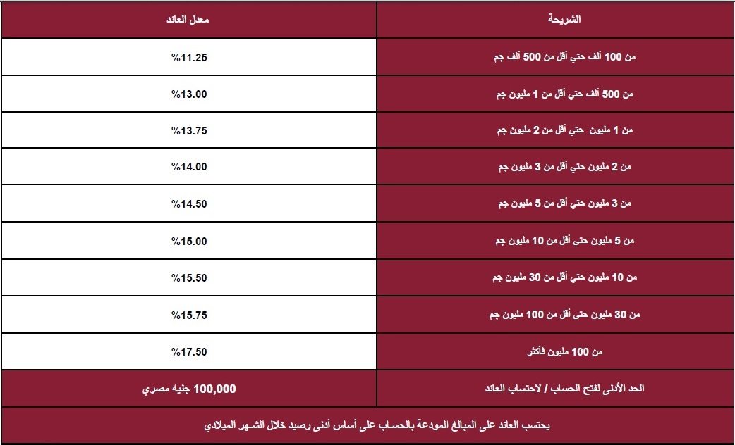 – الحد الأدنى لفتح الحساب واحتساب العائد 100,000 جنيه.