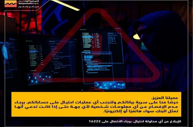 وطالب التجاري وفا بنك إيجيبت عملاءه بحماية بياناتهم والإبلاغ عن أي محاولة لسرقة بياناتهم.