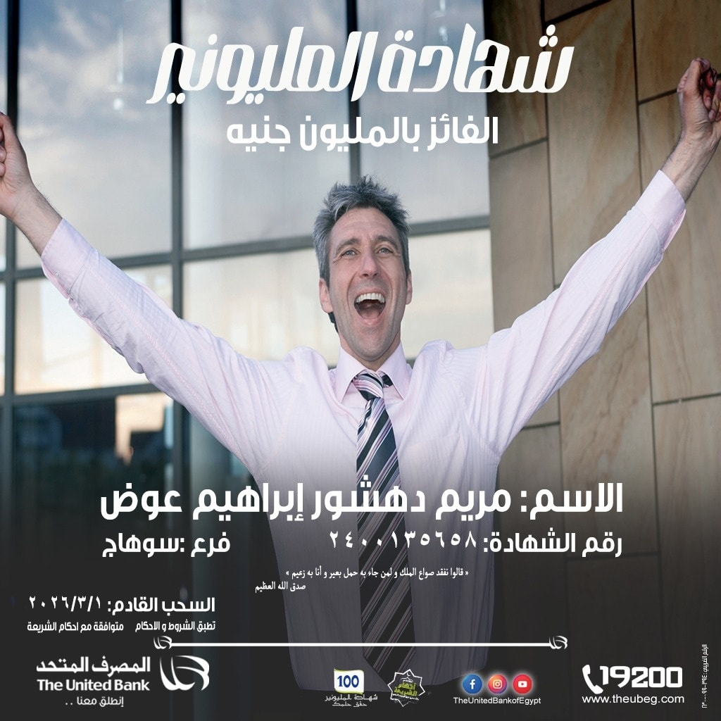 أعلن المصرف المتحد، اليوم الثلاثاء، عن أسم الفائز في سحب شهادة المليونير لشهر فبراير 2026، وكشف البنك أن السحب القادم على شهادة المليونير سيتم في يوم 1 مارس 2026.