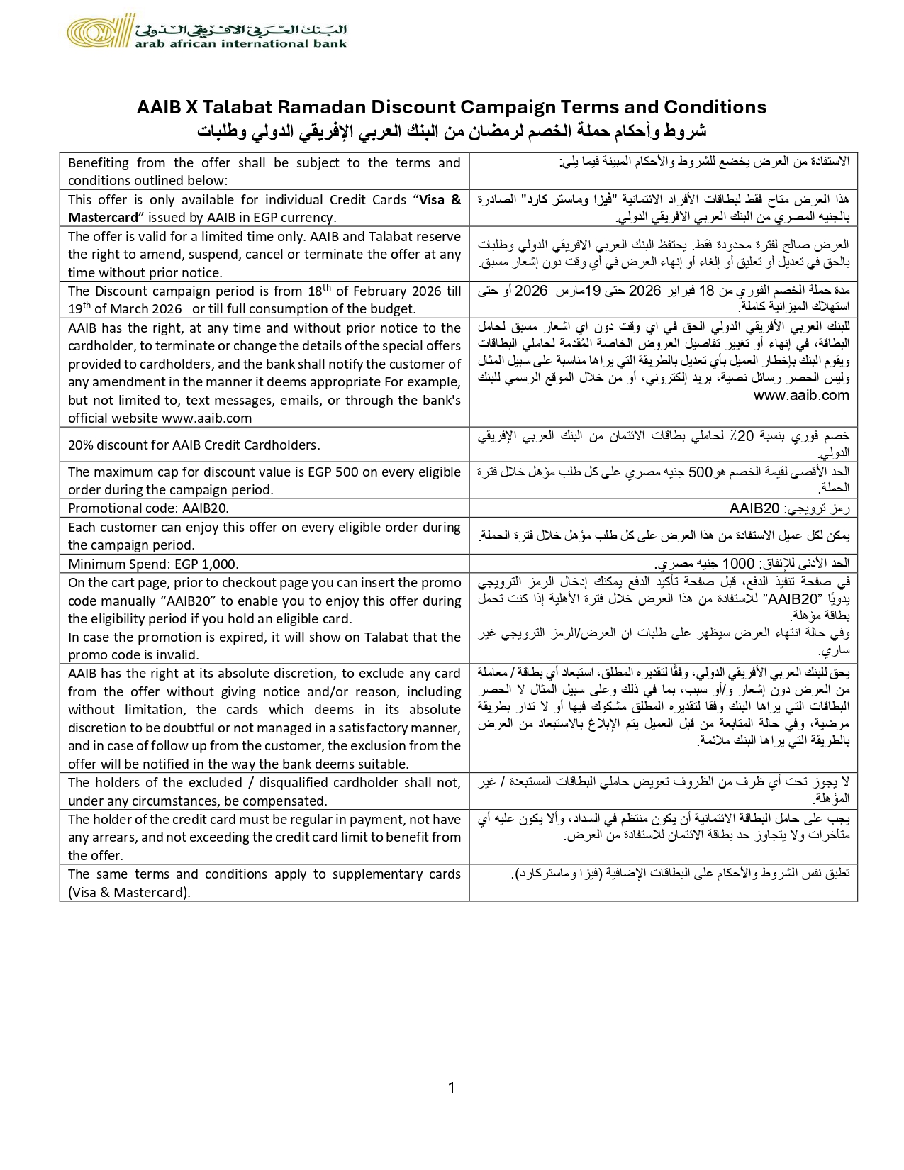 ويتيح البنك لعملائه الاستمتع بـ خصم 20% طوال شهر رمضان على المشتريات من المطاعم أو من talabat mart من خلال أبليكشن talabat باستخدام كود AAIB20، وذلك عند الدفع ببطاقات ائتمان البنك العربى الأفريقى الدولى.