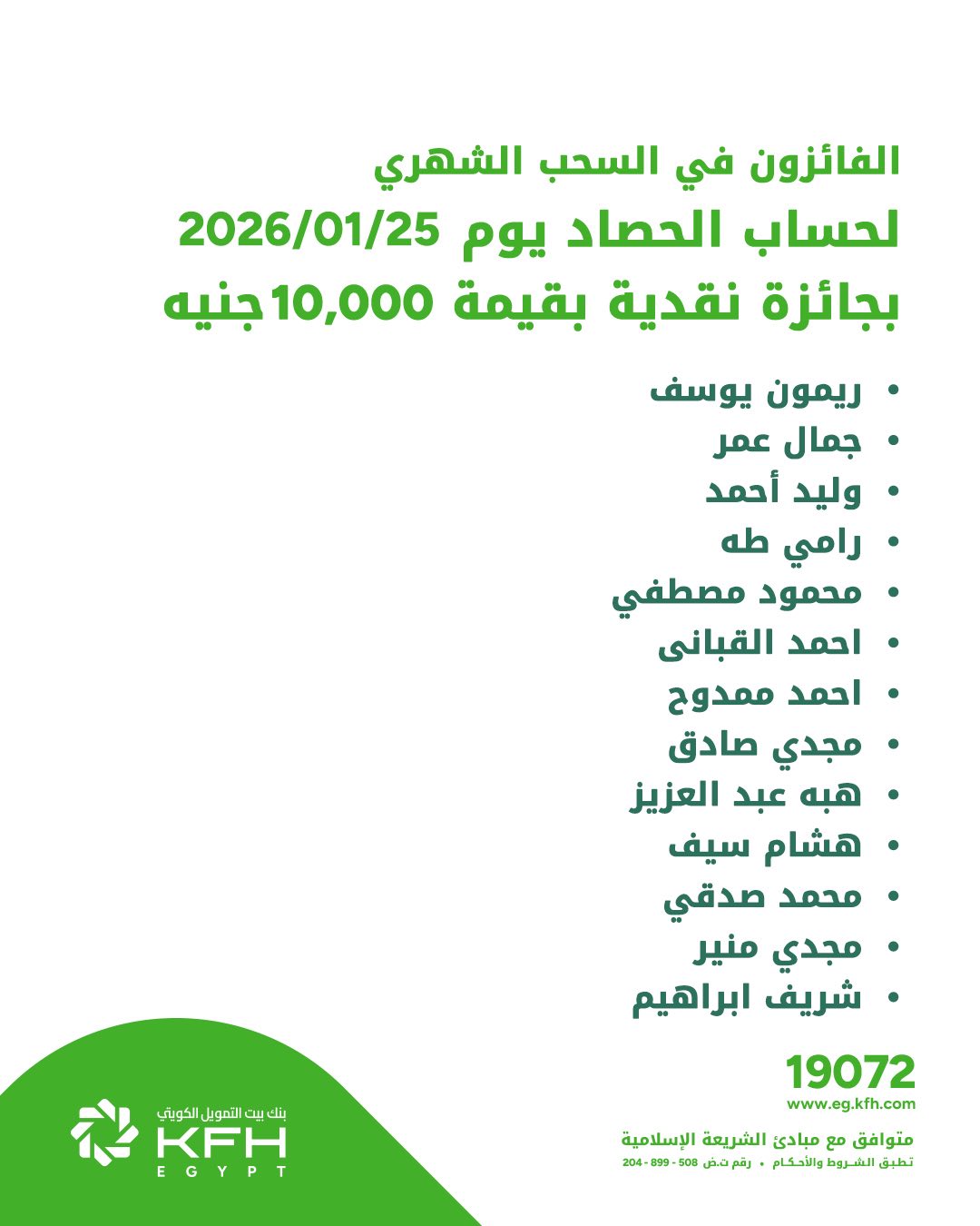 أعلن بنك بيت التمويل الكويتي – مصر عن الفائزين في السحب الأسبوعي لحساب الحصاد، والذي أُجري يوم 25-1-2026، وأسفر عن فوز عدد من العملاء بجوائز نقدية بقيمة 10,000 جنيه لكل فائز.