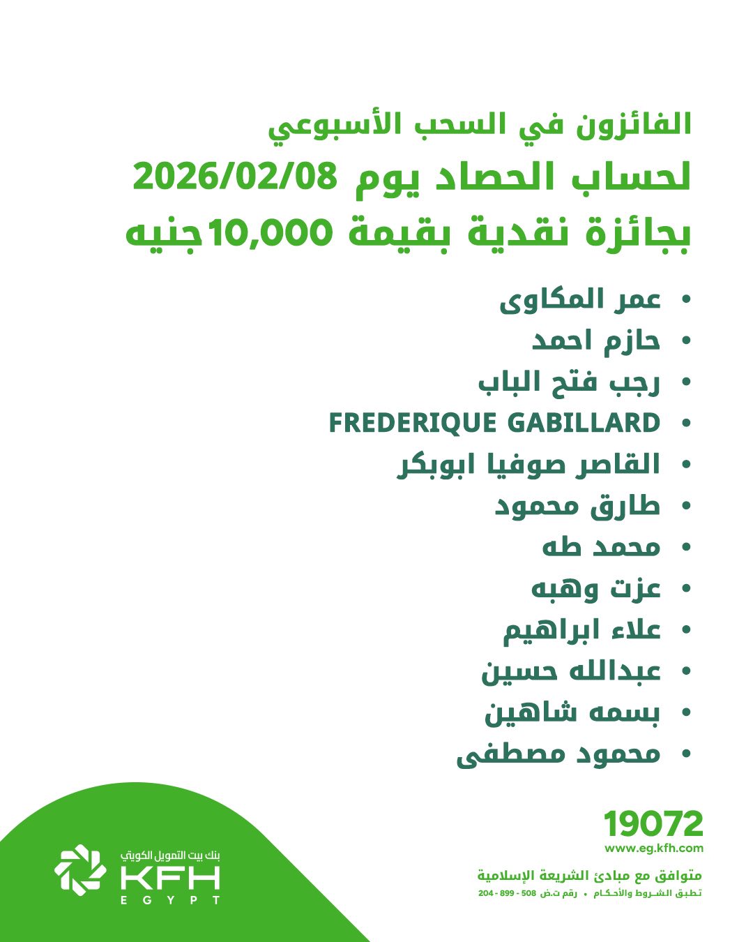 أعلن بنك بيت التمويل الكويتي – مصر عن الفائزين في السحب الأسبوعي لحساب الحصاد، والذي أُجري يوم 8-2-2026، وأسفر عن فوز عدد من العملاء بجوائز نقدية بقيمة 10,000 جنيه لكل فائز.