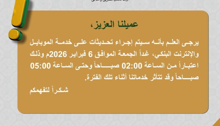 قرر بنك فيصل الاسلامي المصري إجراء بعض التحديثات على خدمة الموبايل والإنترنت البنكي، غداً الجمعة الموافق 6 فبراير 2026م وذلك اعتباراً من الساعة 02:00 صبــــاحاً وحتى الساعة 05:00 صبــــاحاً.