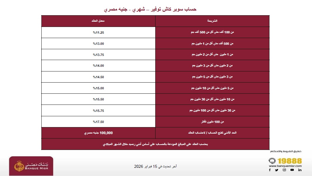 أجرى بنك مصر تعديلاً جديداً على أسعار الفائدة وشرائح الرصيد لـ حساب «سوبر كاش توفير» بالجنيه المصري بعد قرار البنك المركزي المصري خفض أسعار العائد على الإيداع والإقراض بقيمة 100 نقطة أساس يوم الخميس الماضي.
