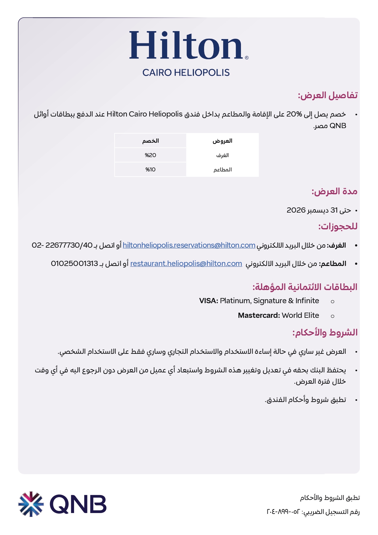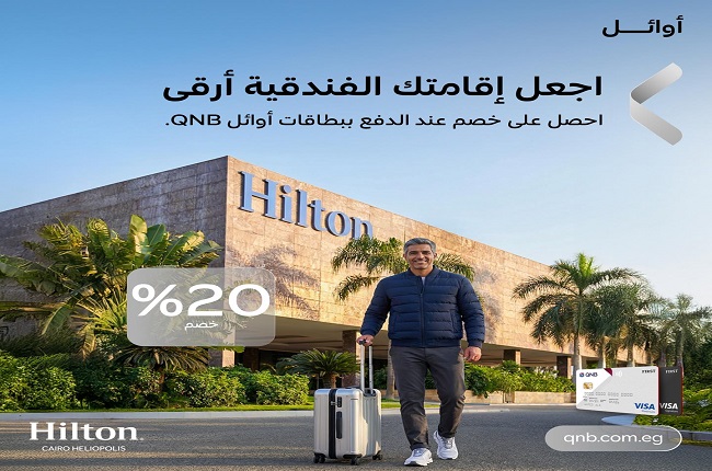 ويتيح البنك للعملاء فرصة الاستمتاع بتجربة فندقية راقية والحصول على خصم يصل إلى 20% في فندق Hilton Cairo Heliopolis عند الحجز باستخدام بطاقات أوائل QNB الائتمانية.
